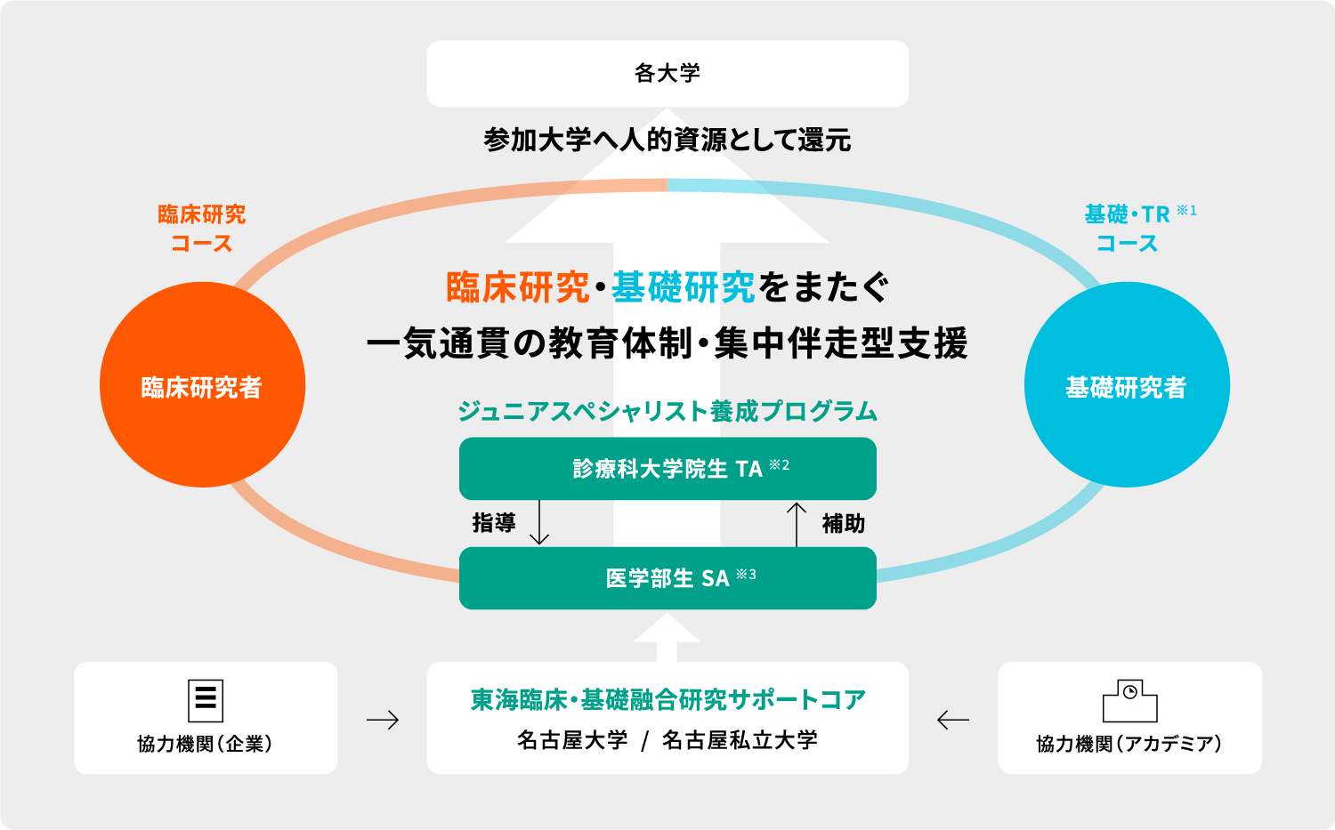 サポートコアの設置・維持 - 名古屋大学、名古屋市立大学に特任教員を配置するほか、「臨床教育」「臨床研究」「学部教育」「基礎・TR(がん分野・神経分野・生殖分野)」の診療科教員がメンバーとして参加。企業・大学関連・研究所も協力機関に入り、プログラムを支える。
